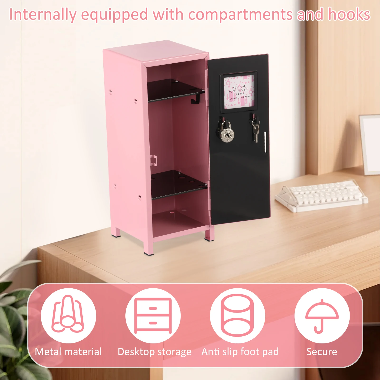 2.Internal Compartments: The mini locker is designed with internal compartments and hooks, ideal for storing a variety of small items. You can organize your belongings the way you like